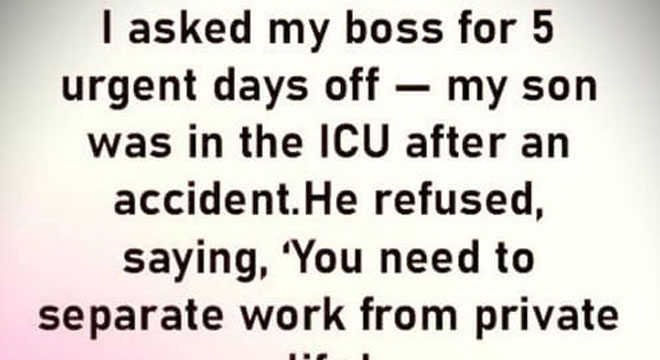 My son had been rushed in after a sudden accident, and when I asked my boss for five emergency days off, he refused—reminding me, with chilling detachment, to “keep work and personal matters separate.” I should have argued or walked out right then. But exhaustion can crystallize what truly matters. So the next day, I returned—not out of obedience, but out of quiet resolve.