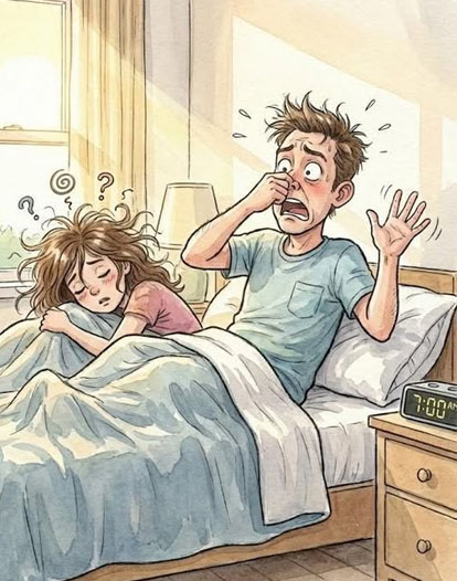 He starts rustling around in the bed looking for it, which of course wakes up his wife, who without thinking asks what’s wrong.