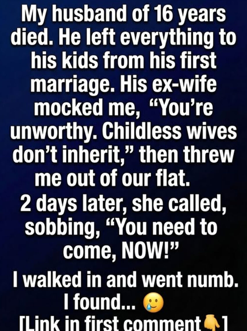Marina had been married to Elias for sixteen years, years filled with quiet routines and shared dreams. When he passed away unexpectedly, grief hit her like a wave she could barely stand against. At the reading of the will, she sat still, hands folded tightly, expecting at least the home they had built together to remain hers. But the lawyer’s words were clear: everything had been left to Elias’s children from his first marriage. The room felt colder with each sentence. When she stepped outside afterward, his ex-wife, Nadine, stood waiting, her expression sharp as glass. “You were never meant to have anything,” Nadine said. “Childless wives don’t inherit.” Then, without hesitation, she told Marina to leave the flat immediately. In shock and exhaustion, Marina left with only a small suitcase and a heart too heavy to protest.