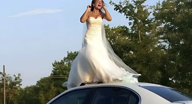 A woman in a wedding dress, veiled and holding a bouquet, was standing on the roof of my husband’s car. She was screaming, her voice full of anger and sorrow, while her heels violently banged against the bodywork.