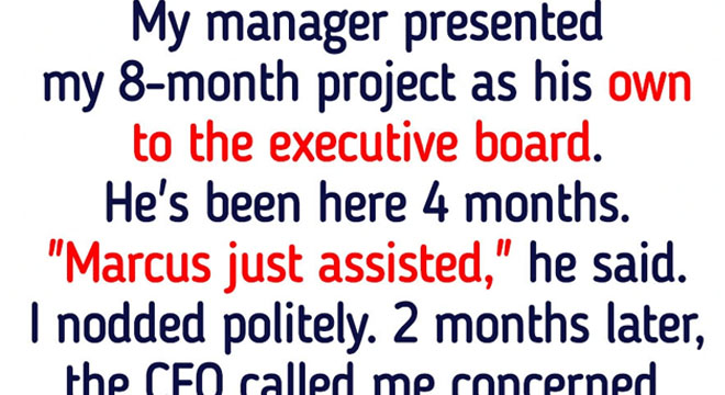 My manager presented my entire project as his own in front of the executive board. I spent 8 months developing it. He joined the team 4 months ago. “Marcus just assisted with some research,” he told everyone. I nodded politely.
