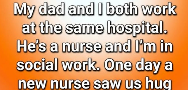 Working in the same hospital as my father always felt comforting, like carrying a piece of home into long, exhausting shifts. He had been a nurse for nearly thirty years, known for his calm voice and gentle humor, while I worked in social services, helping patients and families navigate difficult moments. We rarely crossed paths during busy days, so whenever we did, we’d share a quick hug in the hallway—just a simple reminder that we were both okay. One afternoon, a newly hired nurse saw us greeting each other and smiled politely, but by the next morning, whispers followed us through corridors. Somehow, our innocent hug had turned into gossip about a secret relationship, and the rumor spread faster than anyone expected.