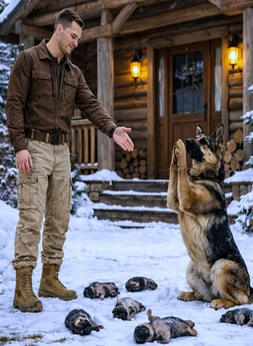 Cold rushed in, sharp enough to sting his lungs. He stepped into the snow, boots crunching softly, and approached slowly. The dog shifted her weight but did not move away. Her body stayed curved around the puppies, even as her legs shook.