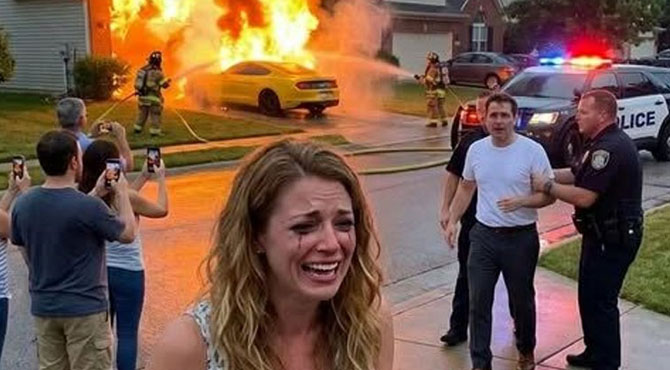 Derek’s confident smile faltered when I kept laughing. It wasn’t joy—it was disbelief. A grown man had set a car on fire simply to punish his wife.