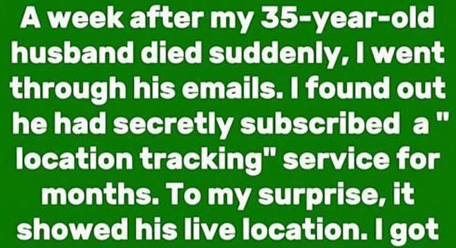 The Story: A week after my 35-year-old husband passed away unexpectedly, I decided to go through his emails. To my astonishment, I discovered a “location tracking” service he had secretly subscribed to for months. Out of curiosity, I logged in using one of his old passwords, and to my shock, it displayed his live location—not far from our home.