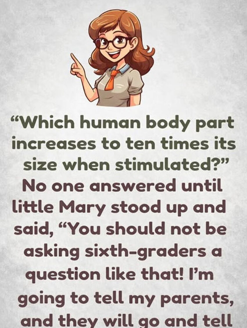 No one answered until little Mary stood up and said, “You should not be asking sixth-graders a question like that! I’m going to tell my parents, and they will go and tell the principal, who will then fire you!”