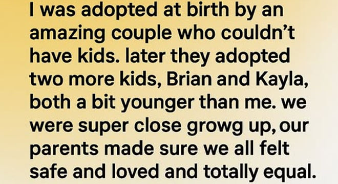 was adopted at birth by two people who never made me feel like anything less than fully theirs. They couldn’t have children of their own, but they created a home filled with patience, laughter, and a quiet kind of strength that held everything together. A few years later, they adopted Brian and Kayla, both younger than me, and from the beginning we grew up as a team. There were no differences in how we were treated—only the steady reminder that family is built through love, not circumstance. Our parents made sure we always felt safe, supported, and equal, and for most of my life, I never questioned where I belonged.