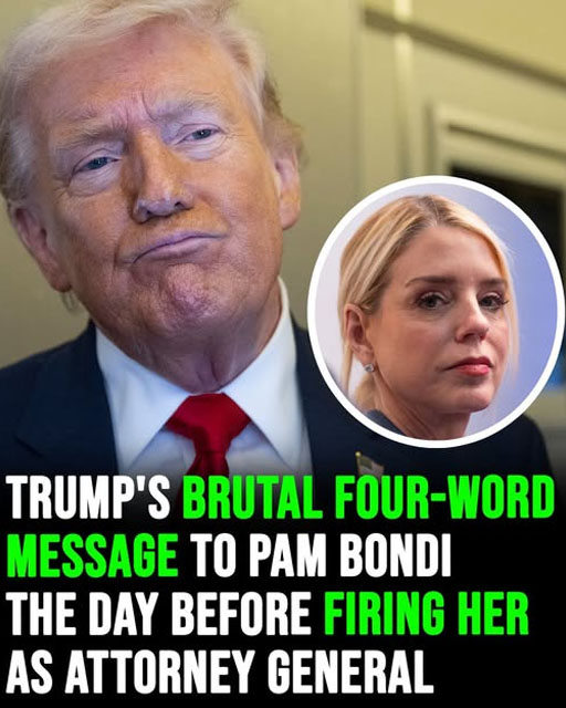 Pam Bondi never saw it coming. One day she was Trump’s “Great American Patriot.” The next, her career was over. Behind the glowing statements and polite press releases, something far more brutal was unfolding. A tense car ride. A four-word message. A president said to be furious and ready to purge his inner ci… Continues…